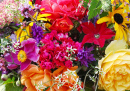 Fermier avec des glaïeuls frais et des fleurs de dahlia