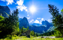 Village alpin rougeoyant à la lumière du soleil