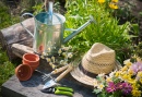 Outils de jardinage et chapeau en paille dans le jardin