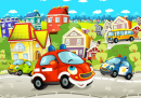 Scène de dessin animé avec des voitures heureuses