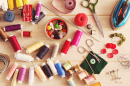 Tools and Accessories For Sewing On Light Wooden Background. Top View.